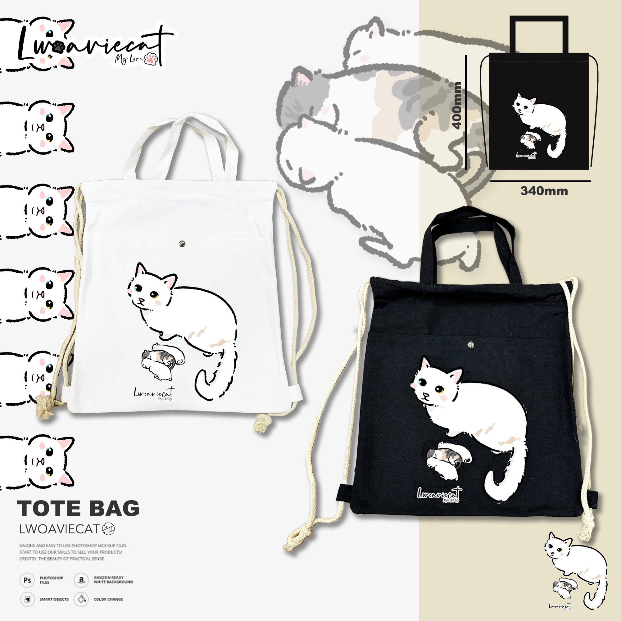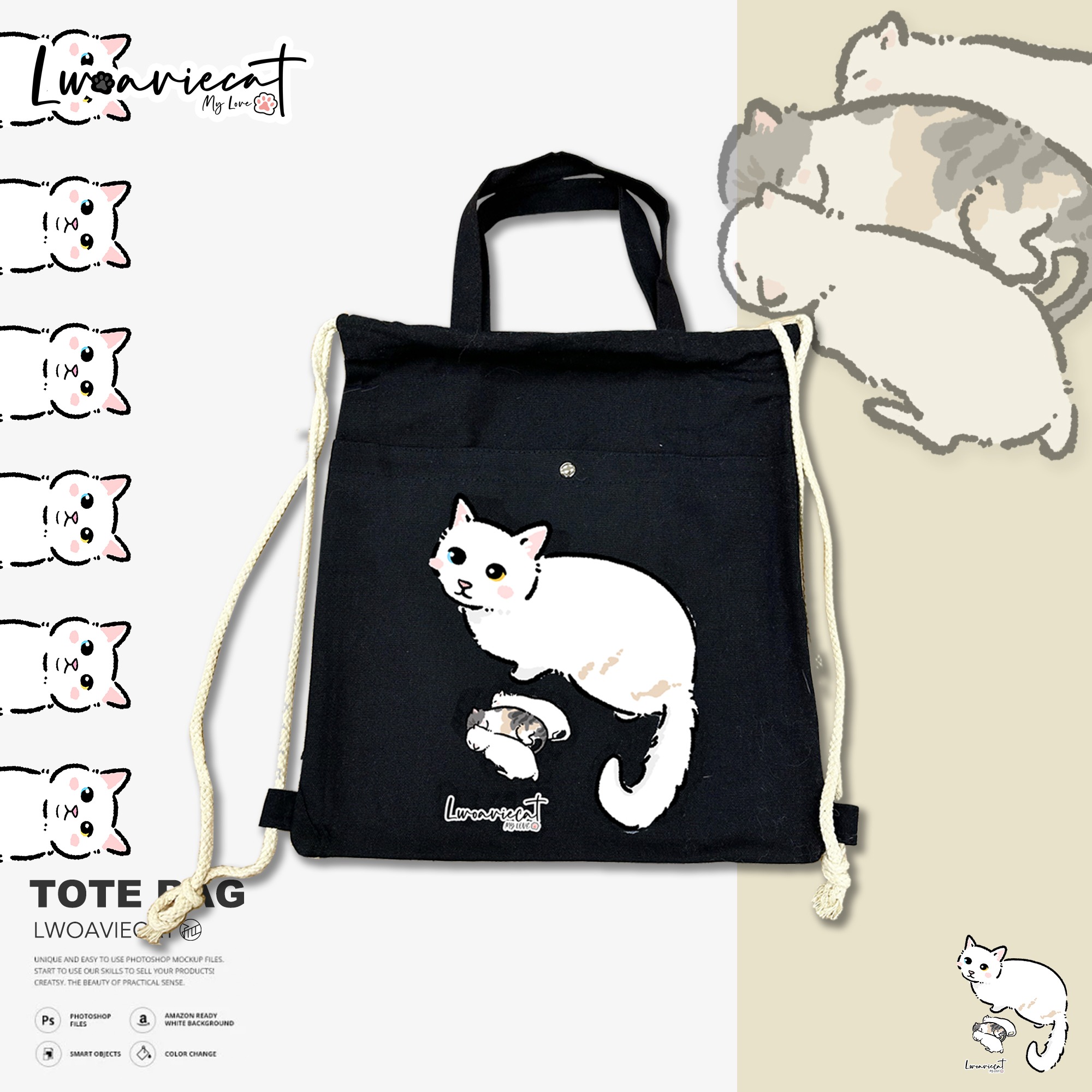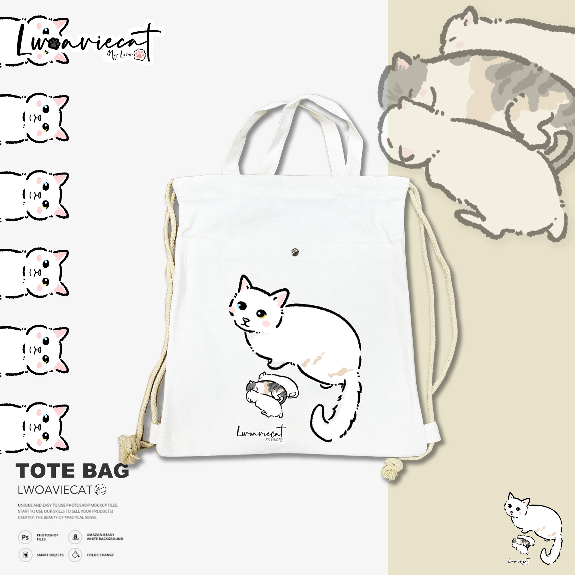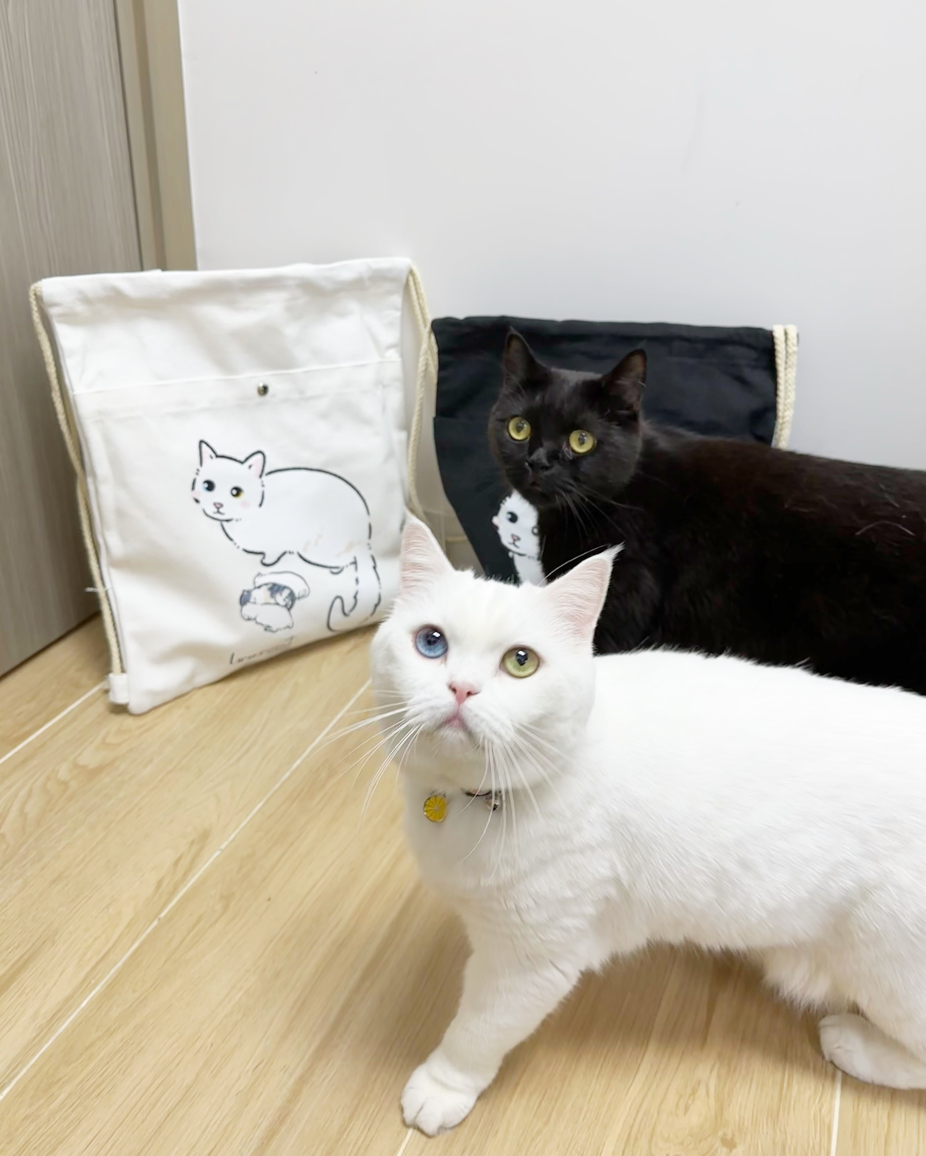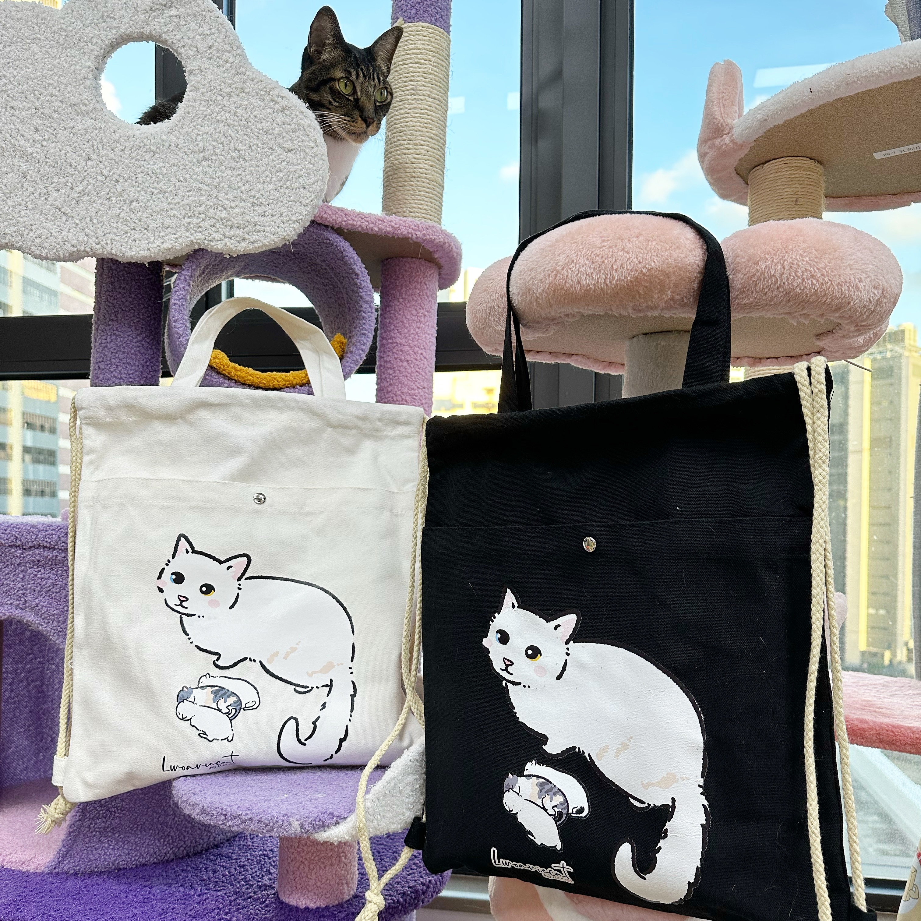 孤貓多用途布袋,可以背在身上,亦可以掛在手臂,用途多元,還有瞳瞳與三貓B一家陪著您!